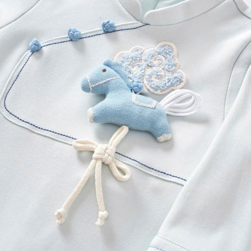 Áo dài xanh da trời nhạt đính ngựa bông phối quần xanh da trời đậm