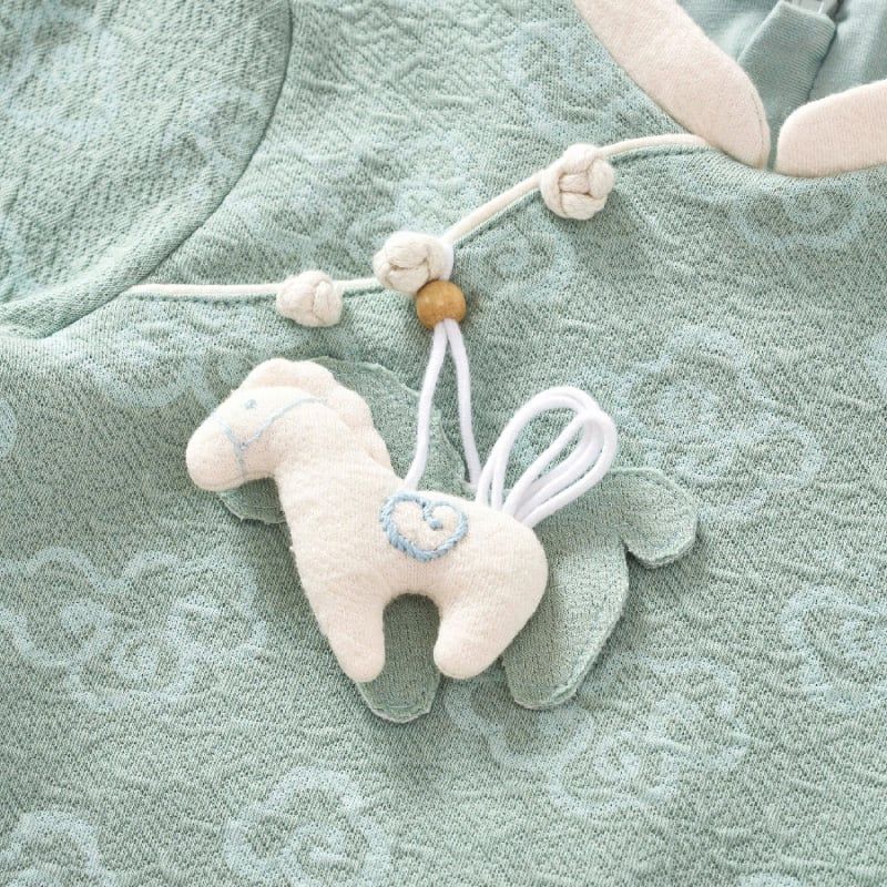 Áo dài xanh ngọc Nous họa tiết đám mây đính ngựa bông phối quần be