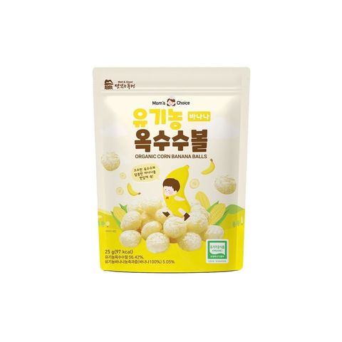 Thành phần bánh bi hữu cơ Mom's Choice vị chuối: Bột ngô hữu cơ (ngô 100%) (xuất xứ Mỹ) 56.42%, Gạo lứt hữu cơ (xuất xứ Hàn Quốc) 13.82%, Đường hữu cơ 10.53%, Fructooligosaccharides hữu cơ (nước tinh khiết, đường) 10.53%, Nước ép cô đặc chuối hữu cơ (chuối 100%, xuất xứ Peru) 5.05%, Sữa không béo hữu cơ (xuất xứ Mỹ) 2.11%, Hương liệu tự nhiên (hương chuối), Muối rang.