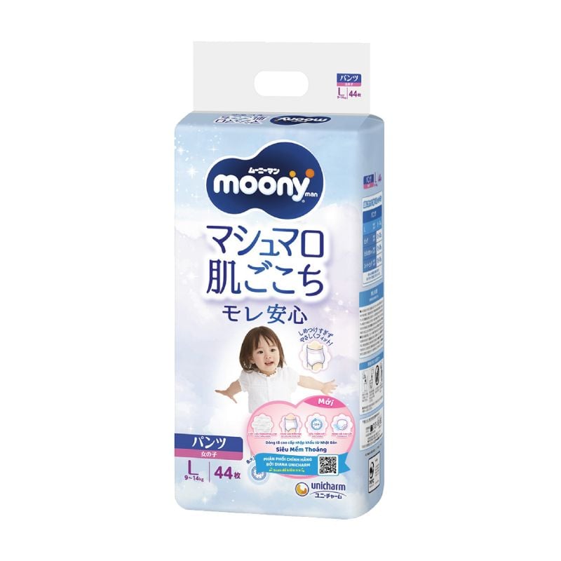 Bỉm tã quần Moony size L44 dành cho bé gái từ 09 - 14 kg có 44 miếng. Bỉm Moony có cấu trúc siêu mềm thoáng với tinh chất dầu Olive chăm sóc da, ngừa hăm tã