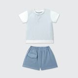 Bộ cộc tay La Pomme phối tay năng động nằm trong BST Xuân Hè 2026 của La Pomme. Set đồ này ghi điểm bởi cách phối layer ấn tượng, tạo hiệu ứng thị giác và tăng tính thời trang cho tổng thể. Phần thân áo nổi bật với họa tiết kẻ ô vuông nhỏ màu xanh ghi nhạt, tạo cảm giác như một chiếc gile thanh lịch. Phần tay áo và gấu áo sử dụng vải màu trắng kem trơn, tạo hiệu ứng như một chiếc áo phông mặc bên trong, mang lại vẻ ngoài layer đầy phong cách. Chiếc quần mang tông màu xanh ghi, điểm nhấn chiếc túi hộp có nắp, tạo nên phong cách khỏe khoắn và tinh nghịch. Sản phẩm được thiết kế và sản xuất tại Việt Nam - độc quyền bởi thương hiệu quần áo trẻ em, đồ sơ sinh La Pomme, sở hữu đặc tính mềm mịn, an toàn cho bé, phù hợp trong tủ đồ quần áo của bé trai.