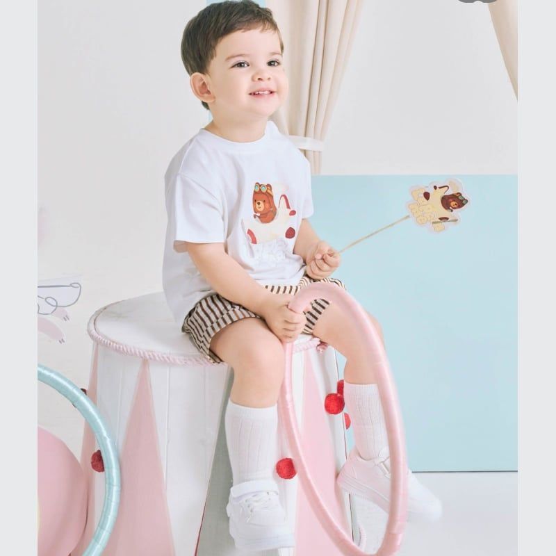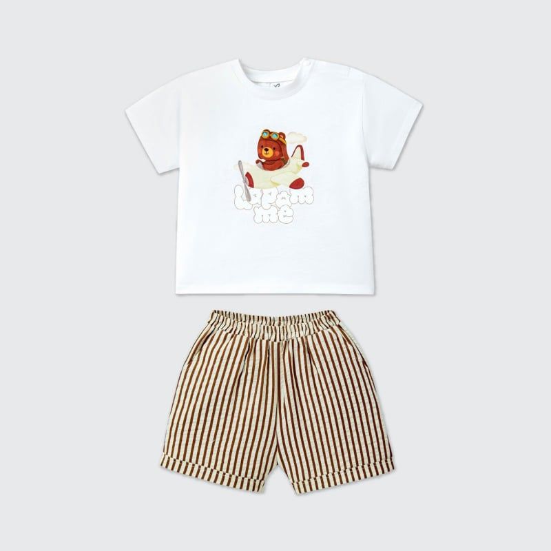 Bộ cộc tay La Pomme xin chào cơ trưởng gấu nằm trong BST Xuân Hè 2026 của La Pomme. Thiết kế này mang đến vẻ ngoài khỏe khoắn với sự kết hợp màu sắc cổ điển và họa tiết sinh động. Điểm nhấn là hình in chú gấu phi công mảng lớn, tạo điểm nhấn vui mắt và hiện đại. Chiếc quần gây ấn tượng với họa tiết kẻ sọc dọc màu nâu đậm mang lại vẻ ngoài sành điệu và thời trang. Sản phẩm được thiết kế và sản xuất tại Việt Nam - độc quyền bởi thương hiệu quần áo trẻ em, đồ sơ sinh La Pomme, sở hữu đặc tính mềm mịn, an toàn cho bé, phù hợp trong tủ đồ quần áo của bé trai.