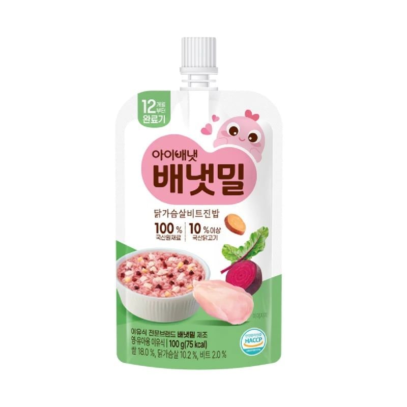 Cháo tươi hữu cơ Ivenet vị Gà củ dền đỏ (100g) là sản phẩm ăn dặm cao cấp từ Hàn Quốc, chế biến từ gạo hữu cơ, thịt gà và rau củ tươi, không chất bảo quản, phù hợp cho bé từ 12 tháng tuổi. Sản phẩm cung cấp dinh dưỡng, chất xơ và vitamin, tiện lợi, dễ hâm nóng bằng lò vi sóng hoặc cách thủy