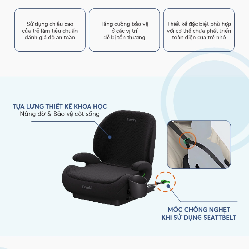 Combi ứng dụng phương pháp đánh giá an toàn dựa trên chiều cao của trẻ thay vì cân nặng, giúp tối ưu khả năng bảo vệ cho cơ thể chưa hoàn thiện của bé.