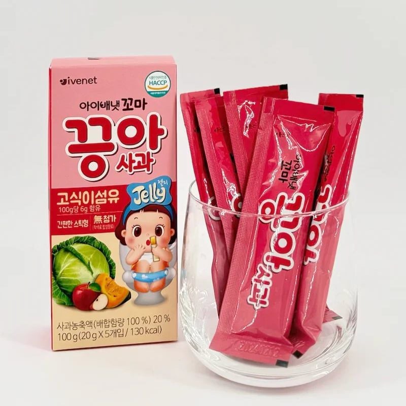 Thạch có chứa nhiều loại rau củ và trái cây được cô đặc trong mỗi gói thạch chất xơ. Chiết xuất 100% từ trái cây rau củ tươi rau xanh/vàng bao gồm bí ngô ngọt, cải xoăn, cần tây và bắp cải, cùng các loại trái cây như mận khô, khoai tây tím và táo.Thạch rau củ Ivenet sẽ giúp bé bổ sung 40% chất xơ trong 1 ngày cho bé đi ngoài dễ dàng hơn và không táo bón.