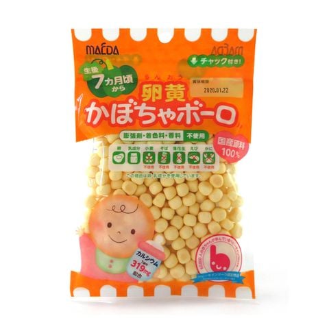 Bánh viên lòng đỏ trứng và bí đỏ Osaka Maeda Boro với nguyên liệu chính từ khoai tây Nhật Bản, được trống trọt an toàn, không chất GMO, an toàn cho sức khỏe bé. Bánh còn có sự kết hợp của bí đỏ và lòng đỏ trứng gà tốt cho bé trong giai đoạn ăn dặm.